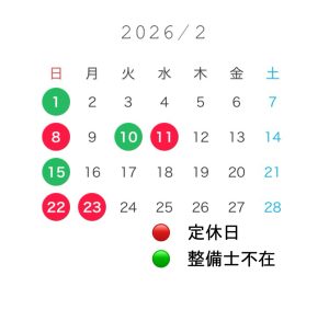 トップページ 新着情報 2月営業カレンダー 新着情報一覧へ 次の記事へ 2月営業カレンダーnew! 2026.01.28 営業日カレンダー 新着情報一覧へ 次の記事へ 営業日カレンダーの最新記事 2025年12月24日 営業日カレンダー 🎍1月営業カレンダー🎍 ... 2025年11月25日 営業日カレンダー 🎄12月営業カレンダー🎄 ... 2025年08月26日 営業日カレンダー 🍀9月カレンダー🍀 🍀9月カレンダー🍀 休み 14㈰15㈷21㈰23㈷ 整備士不在日 7㈰13㈯28㈰ ご来店の際はご予約をお願いいたします...